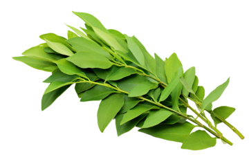 Fresh green curry leaf branch with scattered leaves isolated on transparency background creating natural and vibrant atmosphere