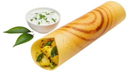 Golden masala dosa with coconut chutney and curry leaves isolated on transparent background