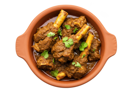 Mutton Curry Slow cooked curry with tender pieces of mutton in a spiced gravy. isolated on a transparent background, top view, PNG."