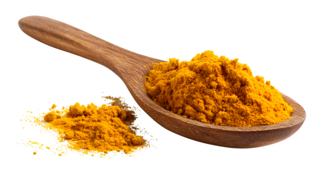 Turmeric (Curcuma) powder pile in wood bowl isolated on transparent png