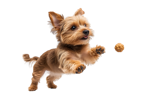 Little brown mixed breed dog jumping sideways for treat isolated on white background