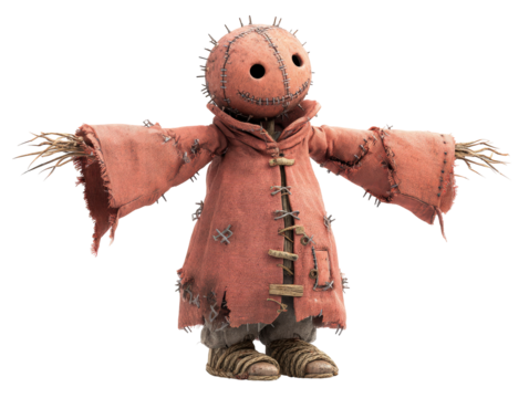 Creepy scarecrow doll with a spiked stitched head and a tattered red coat in a T-pose.