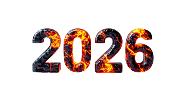 The year 2026 rendered as fiery, crackled text against black