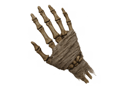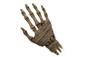 Undead mummy skeleton hand reaching with bony fingers wrapped in ancient bandages, transparent background for halloween