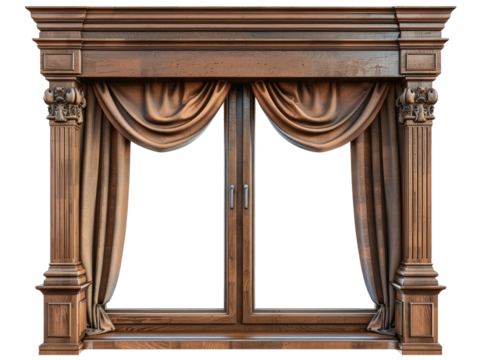 Wooden window with curtains isolated on transparent background