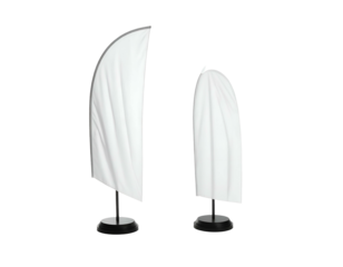 Two white, curved flags with black bases set against a solid black backdrop