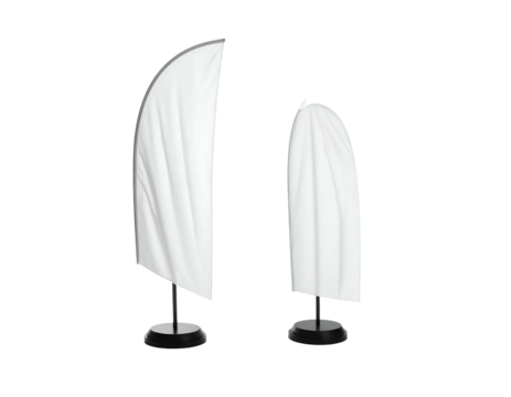 Two blank white feather flags stand tall on black bases, isolated on black background