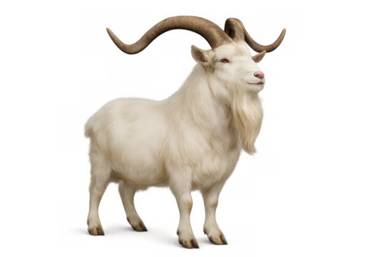 White goat standing with long curved horns and beard, looking aside, farm animal cut out, transparent background