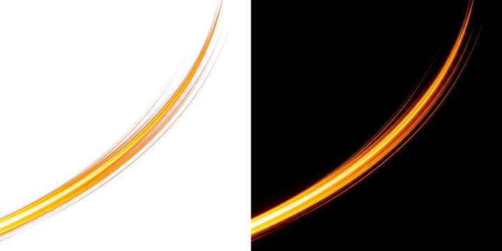 Golden light streaks background effect abstract curved lines with glow and blur on black and transparent background for design