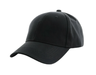 A plain, dark baseball cap. Features a curved brim, stitched panels, and a top button