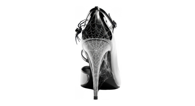 Elegant high-heeled shoe in black and white, showcasing intricate design details.