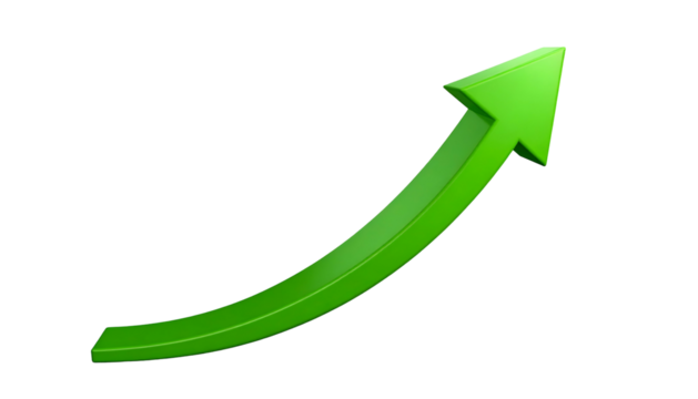 Red curved 3d arrow rising, representing business growth, positive trajectory against transparent backdrop