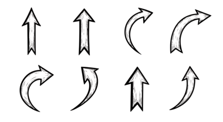 Hand drawn doodle arrow set vector collection featuring sketch pointers showing up direction, curved movement, growth, progress, and essential navigational concepts