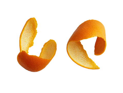 Two curled orange peels against a transparent background