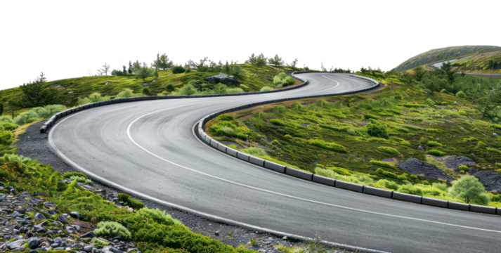 A curvy road carved into the side of a mountain, surrounded by dense foliage and trees, cut out and isolated on a transparent background, with a distant horizon