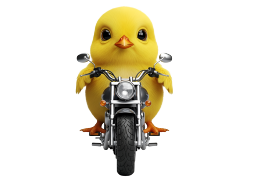 A cute, yellow, fluffy chick, cartoon-style, riding a small motorcycle directly facing the camera with a serious expression. isolated on transparent background