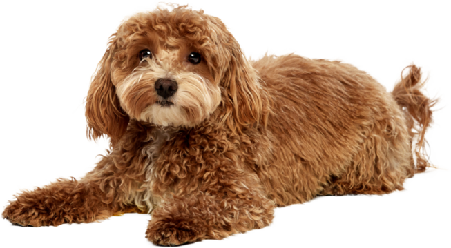 Poodle dog lying and looking forward with soft brown coloring. Concept of brand mascot usage, website headers, service advertising, pet care promotion, commercial design. Transparent background