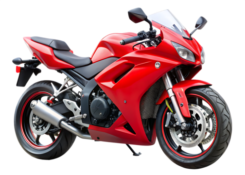 Shiny red sport motorcycle with gold exhaust and black seat isolated on a transparent background red motorcycle