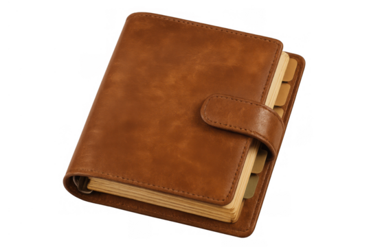 Brown leather bound planner on a transparent background, depicting organization, scheduling and professional tools