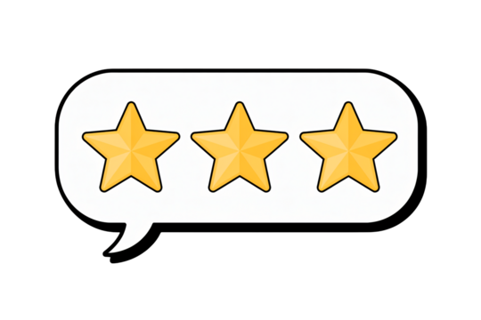 Three star rating in cartoon speech bubble with yellow stars on white background for customer review