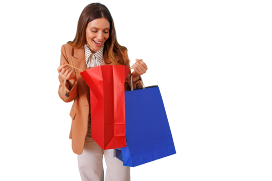 Woman enjoying shopping experience, holding colorful retail bags after buying gifts with a transparent background