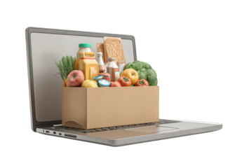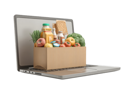 Online grocery delivery.  A laptop displays a cardboard box filled with assorted produce and packaged goods