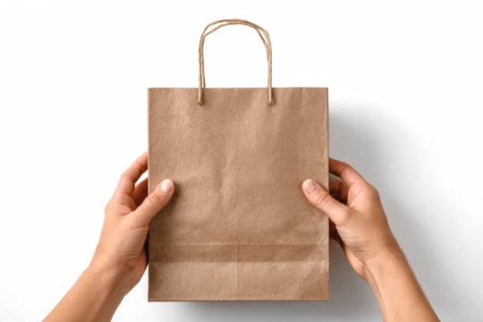 Parcel cardboard brown box for delivery in holding hand man isolated on cut out PNG or transparent background. Package is presented with care and readiness. Hand Postman.