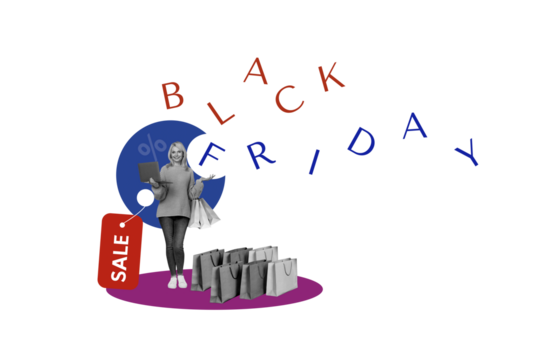 Composite photo collage of happy girl hold laptop bags purchase sale percent shopaholic online order isolated on painted background