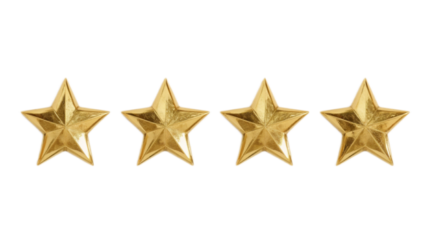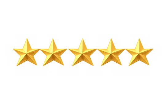 Five golden stars representing a five star ranking on a transparent background, ideal for customer satisfaction surveys