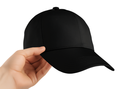 Hand Holding Blank Black Baseball Cap Mockup for Custom Design isolated on a transparent background