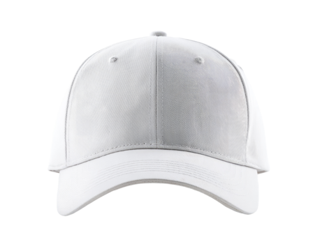 Front view of a plain, white baseball cap.  A simple, blank,  athletic hat