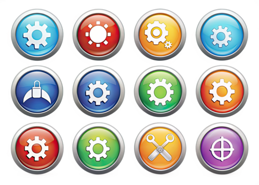 A collection of twelve colorful circular icons featuring settings symbols, isolated on a white background. Generative AI