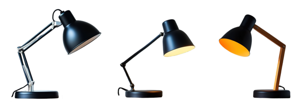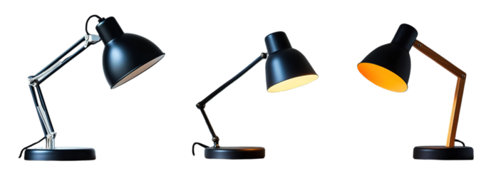 Three table lamps with adjustable arms, two black ones and a brown one
