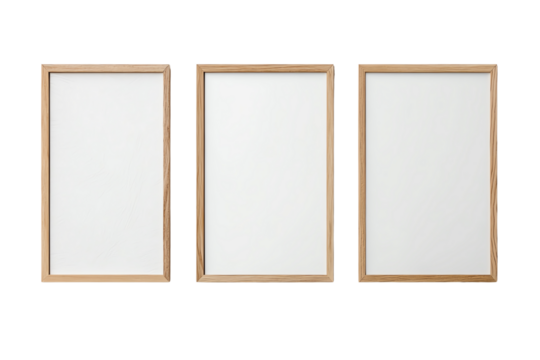 Three empty wooden frames standing side by side on a white background.