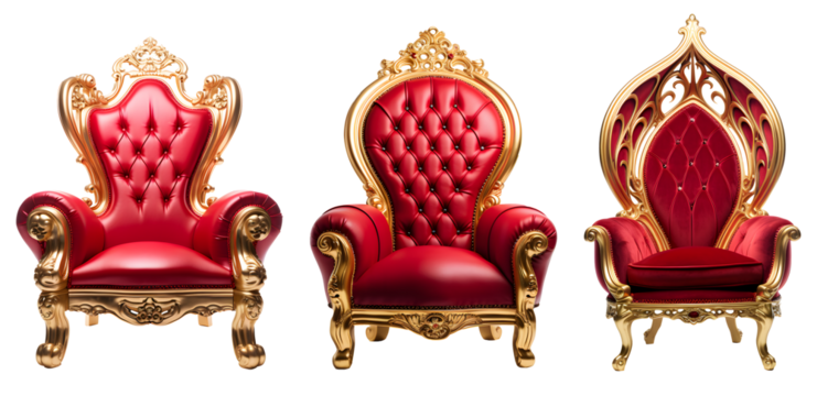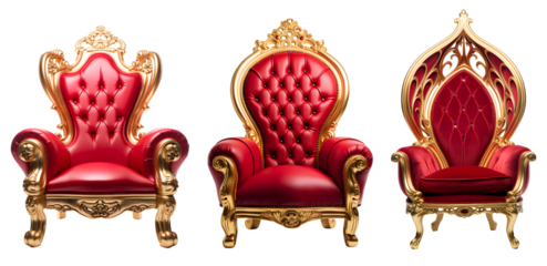 Red luxury king chairs with golden ornaments cut isolated on transparent background cutout, PNG file.