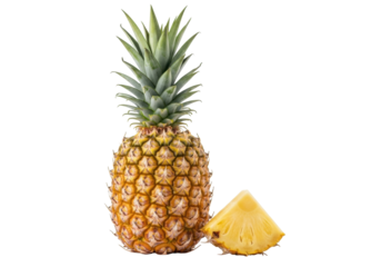 Isolated pineapple fruit with piece on a plain surface, ananas comosus tropical food