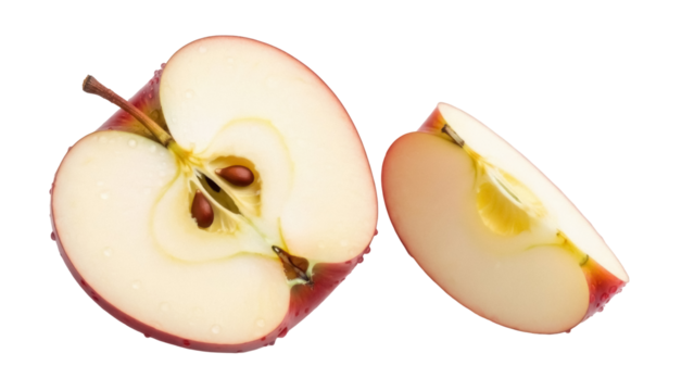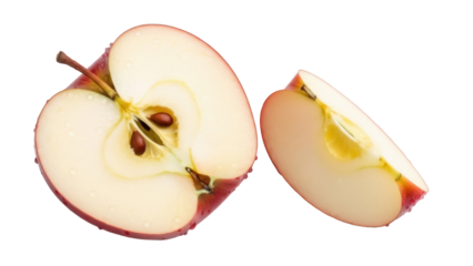 Sliced Red Apple Pieces and Petals Floating Mid-Air, cut out transparent