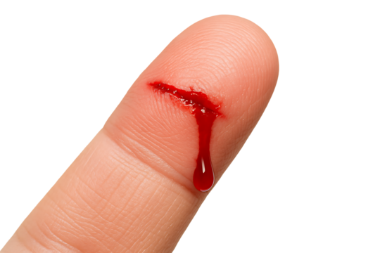 Injured finger with bleeding cut isolated on transparent background
