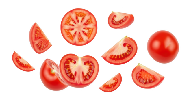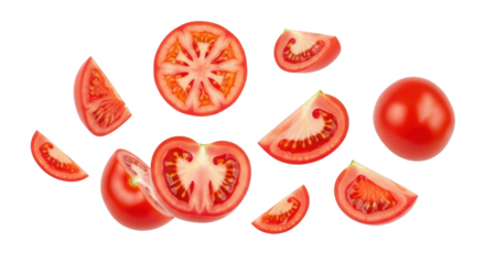 Juicy ripe tomato slices floating in mid-air isolated on transparent background