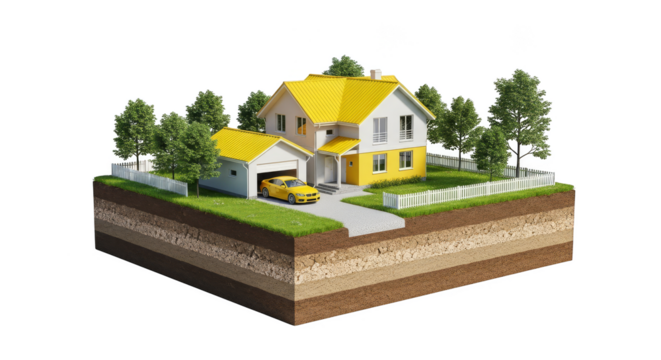 Soil, Cross Section with Layers, Grass, and Visible Root System isolated on a transparent background, cutout, PNG