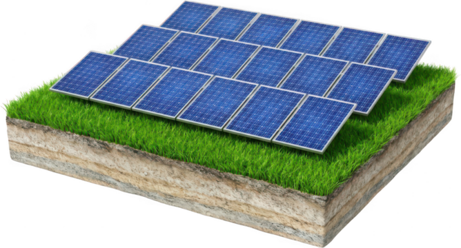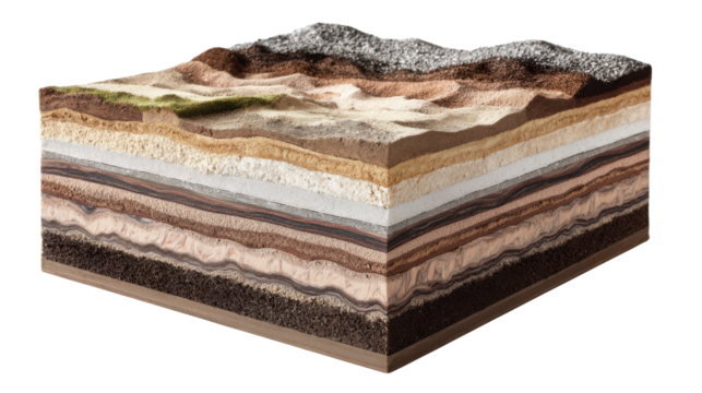 Cross-section of a stylized planet with geological layers, water, and vegetation