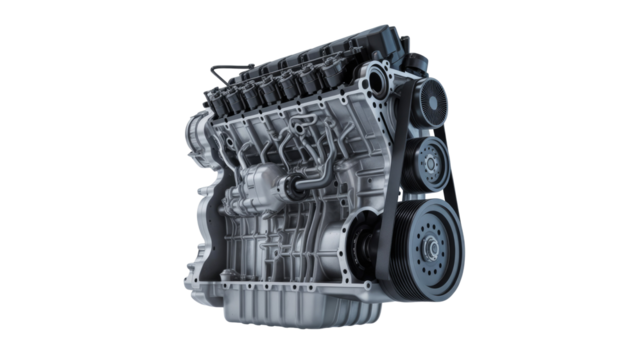 Detailed cutaway of an automotive transmission isolated on transparent background, revealing intricate gears and mechanical components
