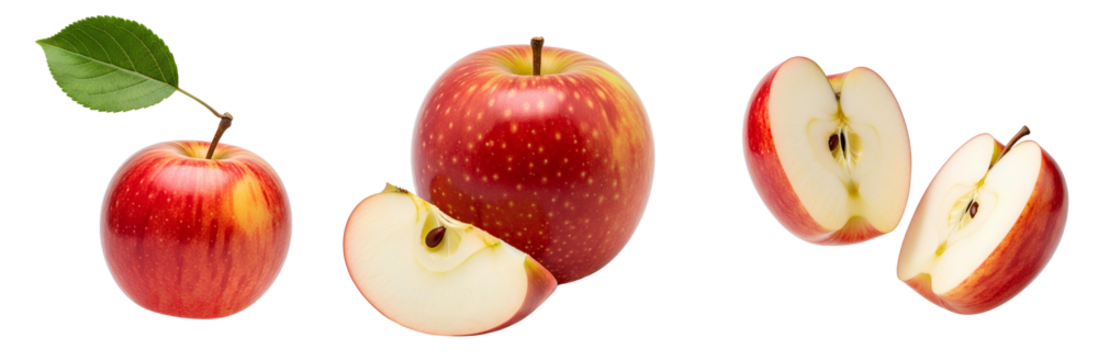 Apple isolated png. Red apple half and piece collection on transparent background. PNG format. Red apple slice set with no background. Full depth of field.