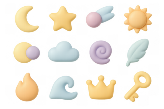 Pastel cartoon icons: sun, moon, clouds, and more in soft 3d design