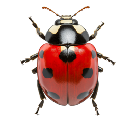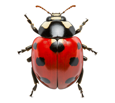 A detailed, isolated image of a ladybug with striking red wings and black spots, set against a transparent background.