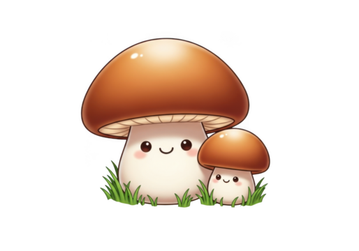 Two cute cartoon mushrooms with smiling faces on transparent background