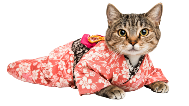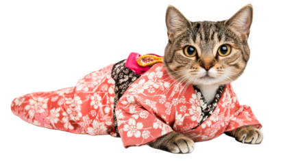 Cat in floral kimono on transparent background
