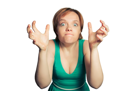 Happy woman gesturing with hands against transparent background