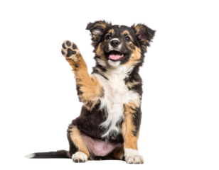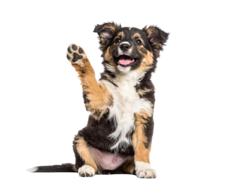 Cute Puppy Sitting with Front Paw Raised in Mid-Wave Gesture, Isolated on White Background