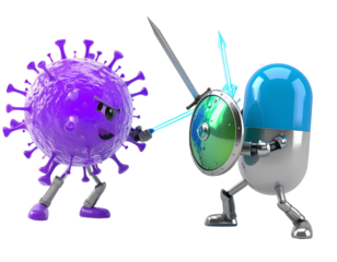 Cute 3D armored medicine guardian with holographic sword versus monster microbe – isolated on transparent background PNG